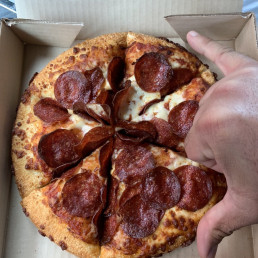 Pepperoni, green pepper, sliced mushrooms and pizza mozzarella (16 slices 250 Cals/slice)